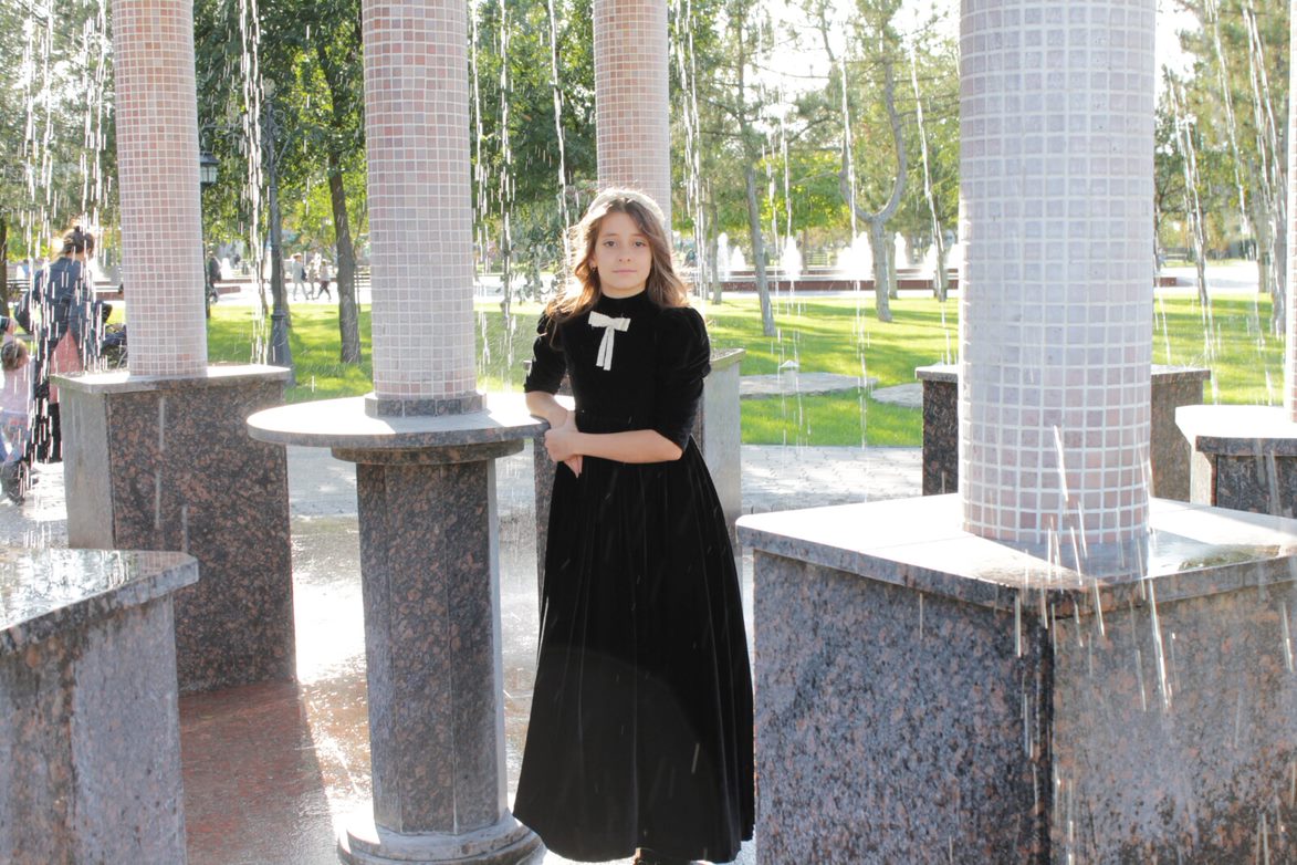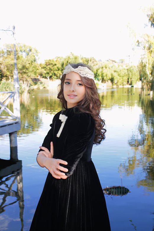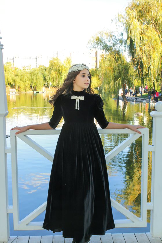 Keep it simple yet chic with this Black Velvet dress. This traditional style dress features a high mock neck with a white bow tied around it for a dash of contrast. The three-quarter length sleeves draw the eye to its designed shoulders and flank either side of the A-line waist.