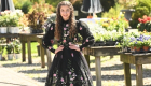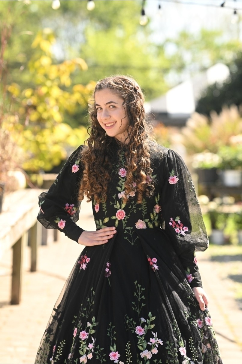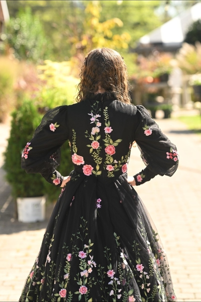 Like a garden in motion—The Black Dainty Daisy Dress blooms with vibrant florals, scattered like wildflowers from hem to bodice. The ruffled neckline adds a touch of whimsy, while puffed sleeves taper into sleek, straight cuffs for a silhouette that’s both playful and poised. A dreamy blend of drama and delicacy.