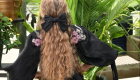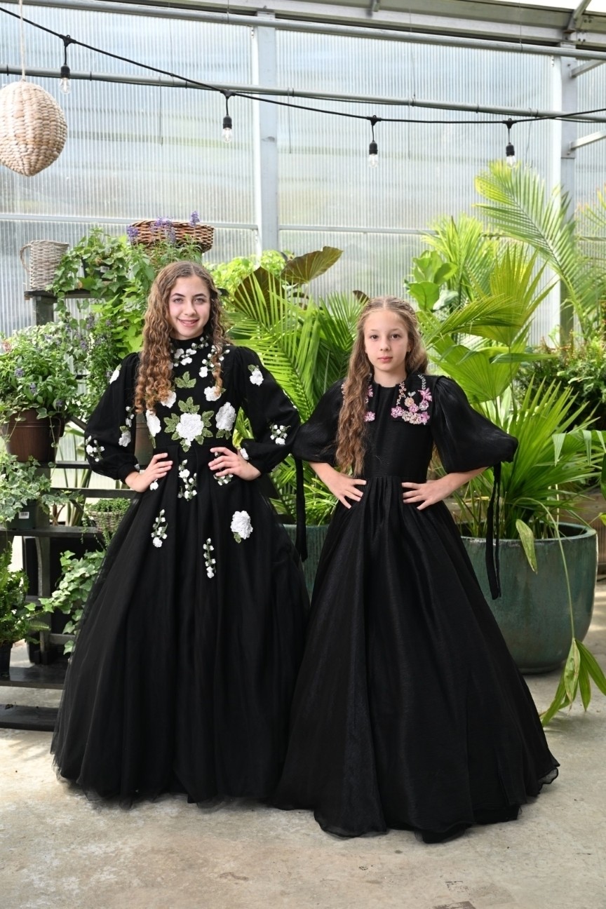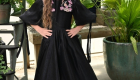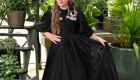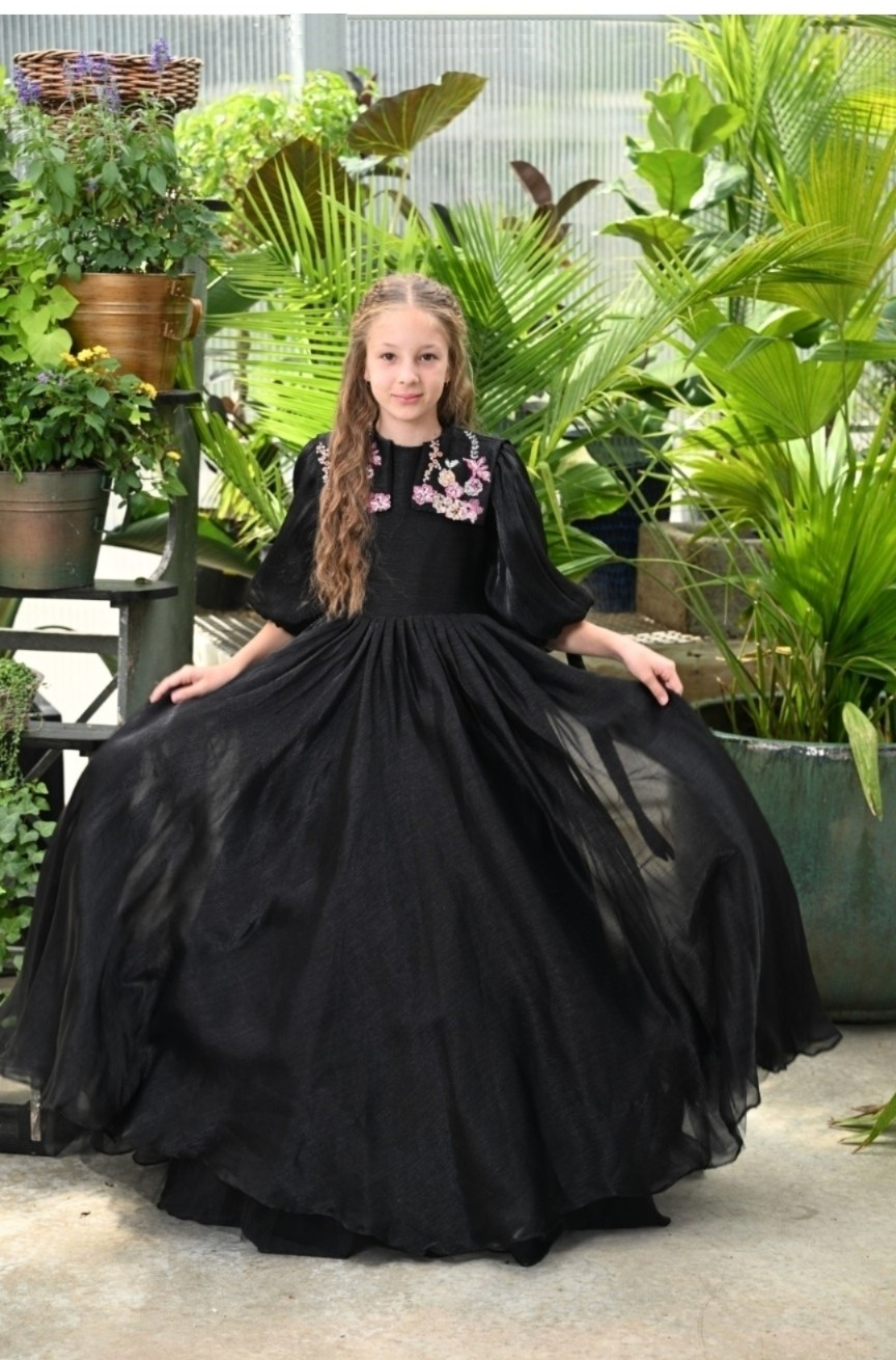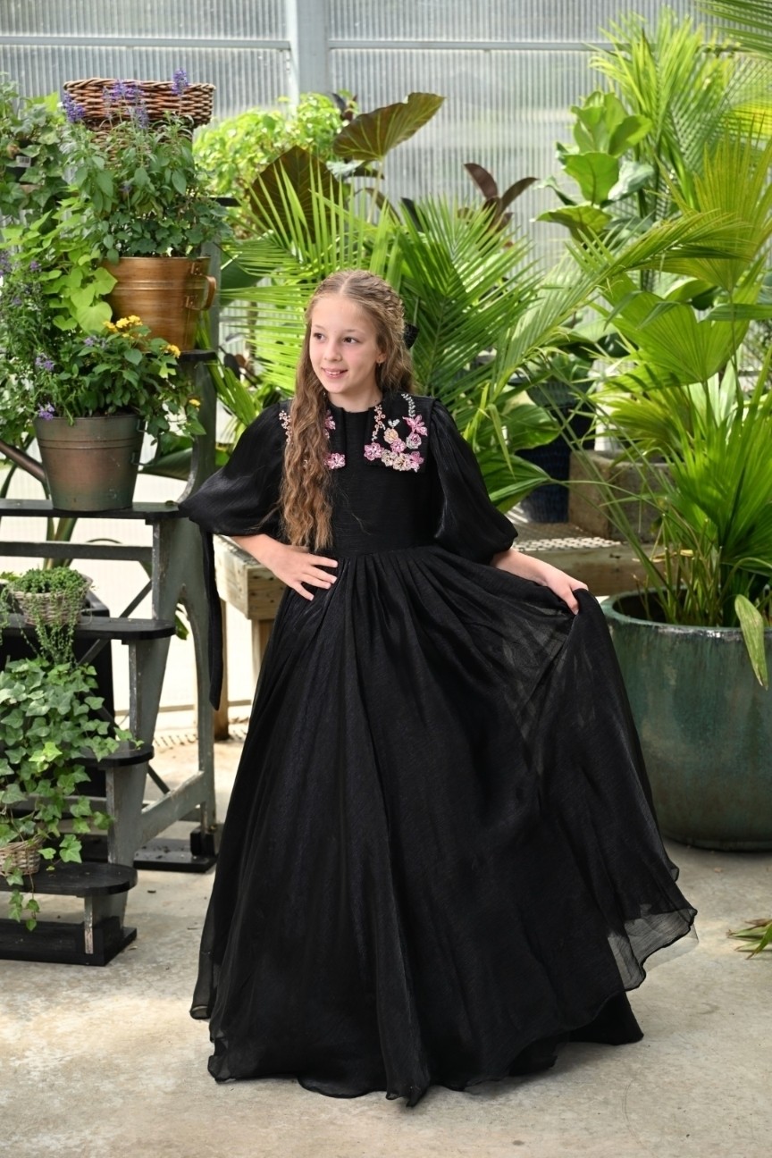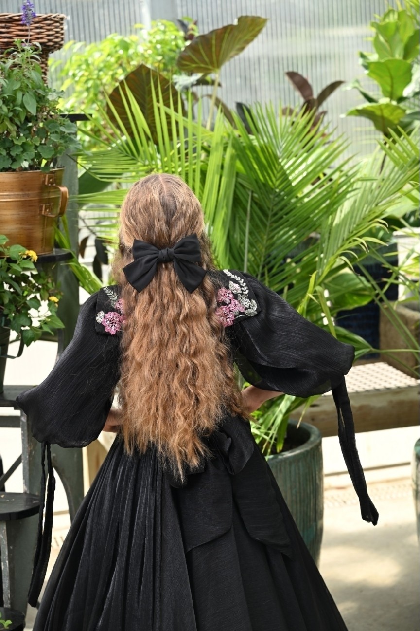 The Black Floral Square Collar Dress is made entirely from black crepe chiffon, offering a fluid, airy silhouette with subtle texture. A square Collar frames the neckline with fuchsia beaded floral embroidery. Side ribbons tie into a sweet bow for a touch of charm, while covered buttons trail over the hidden back zipper, adding some quiet elegant details!