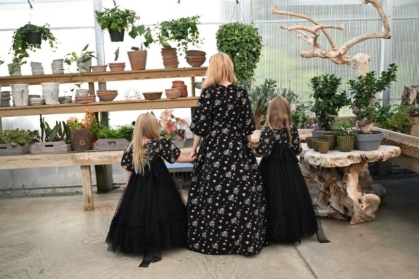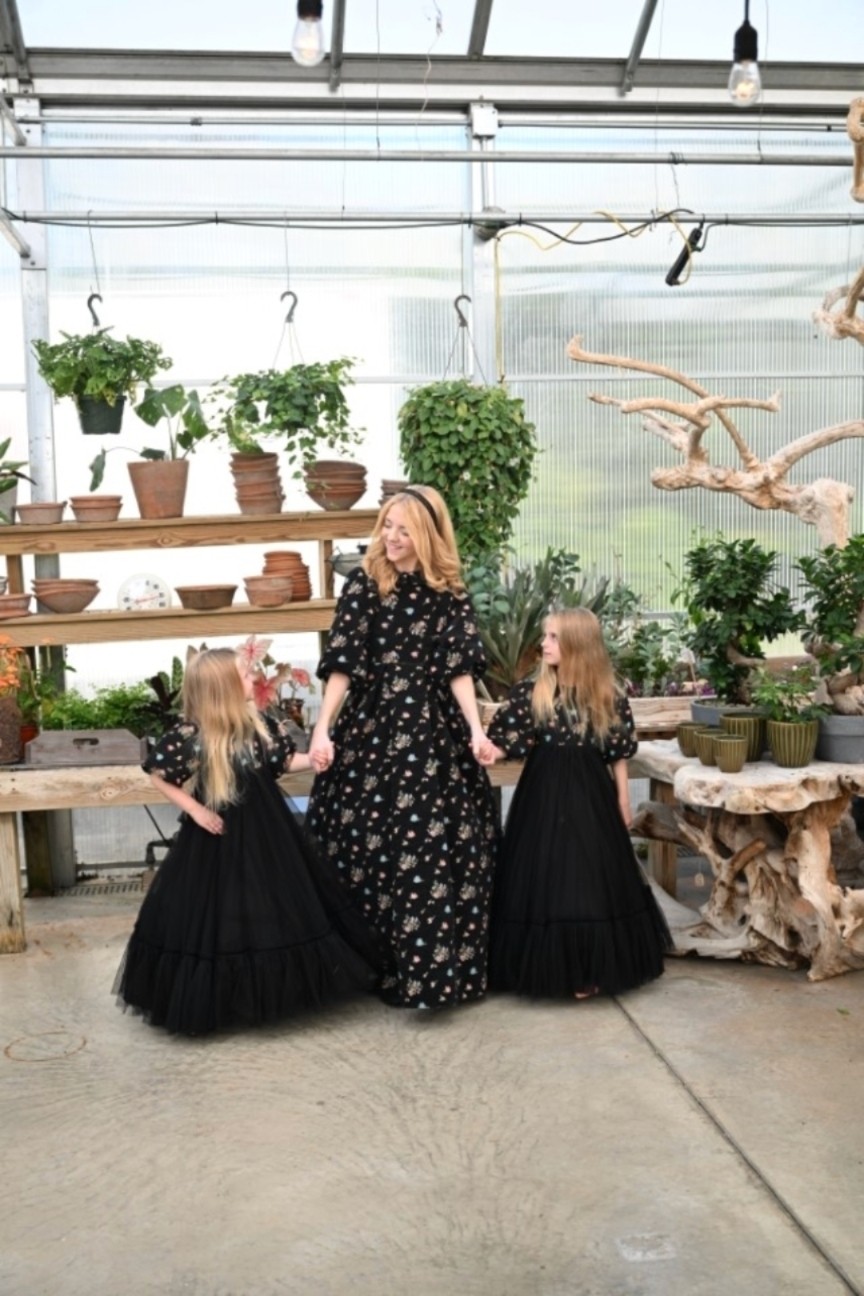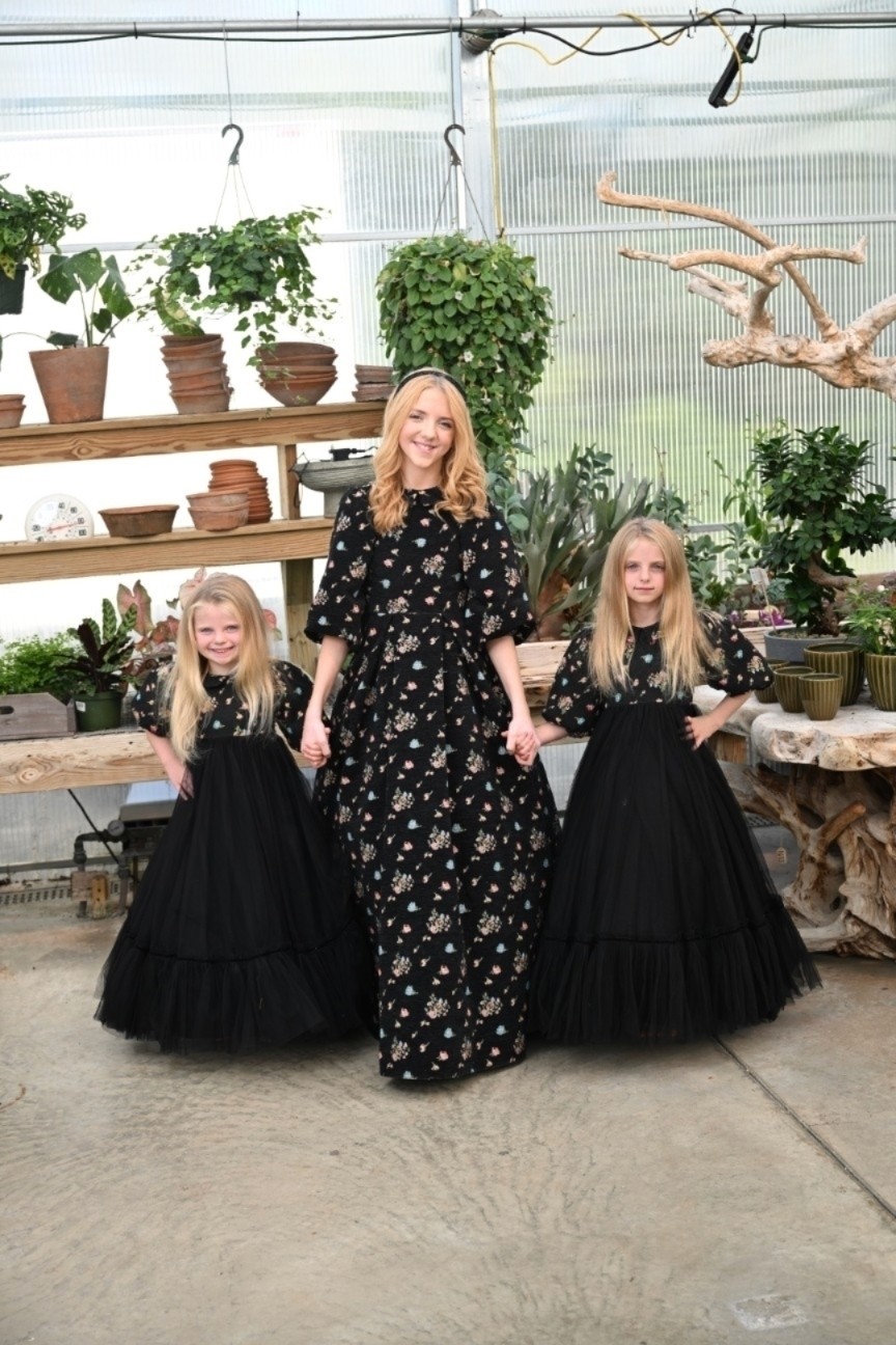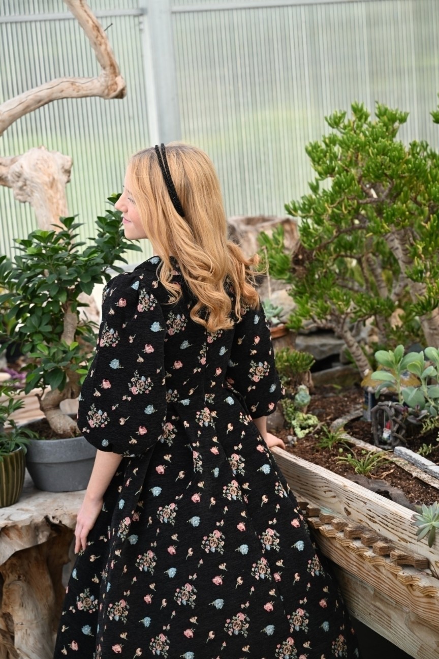 The Black Garden Brocade Teen Dress offers a sophisticated take on our signature floral brocade. Fully crafted in the rich Garden Brocade fabric, this design balances elegance with modern charm. The pointed collar and puffed sleeves lend a polished, tailored feel, while the pleated skirt adds graceful movement. A timeless silhouette made for teens ready for a more grown-up look — refined, confident, and effortlessly chic.