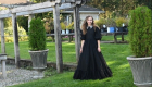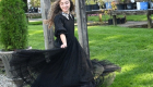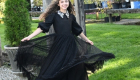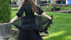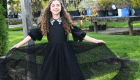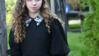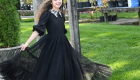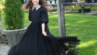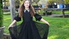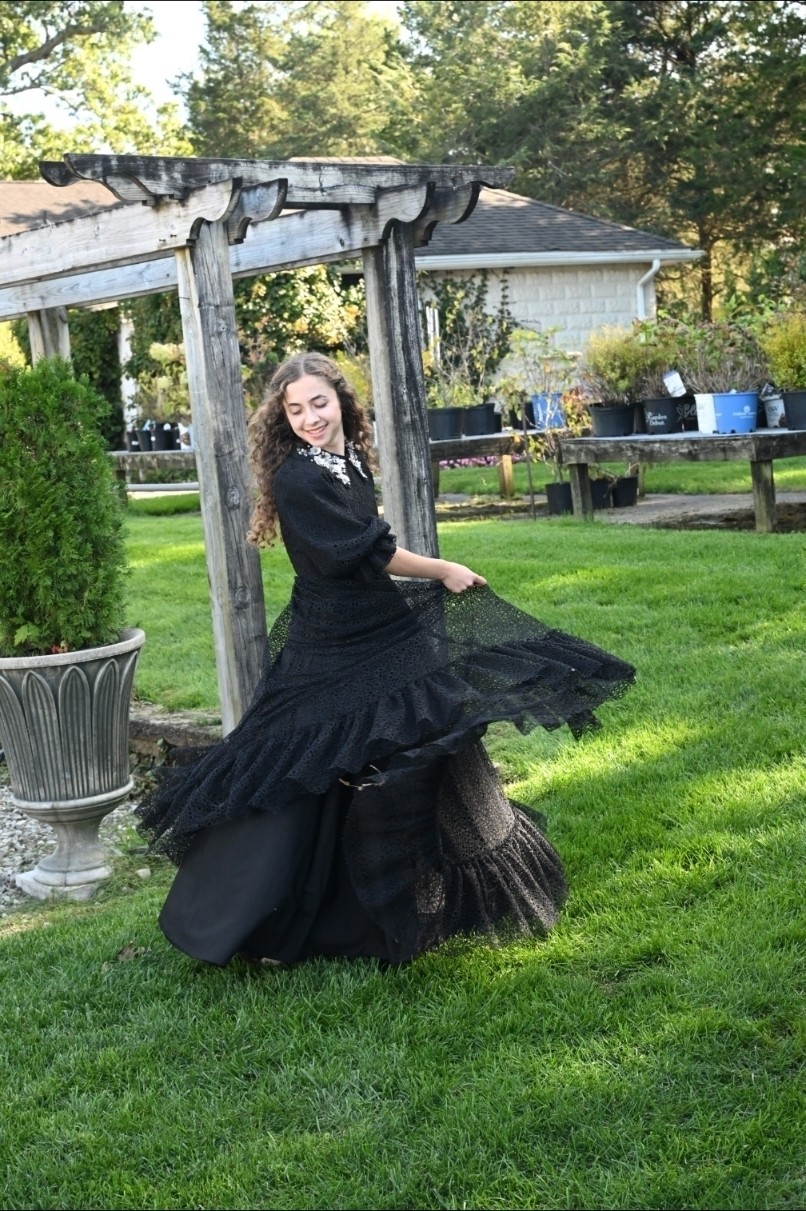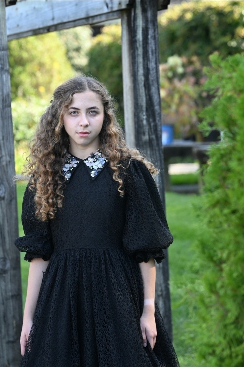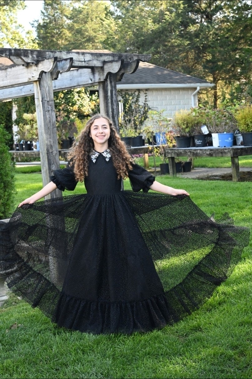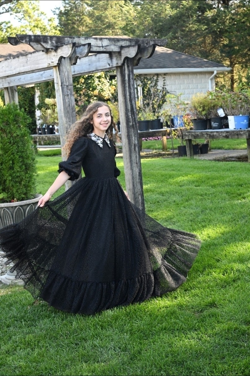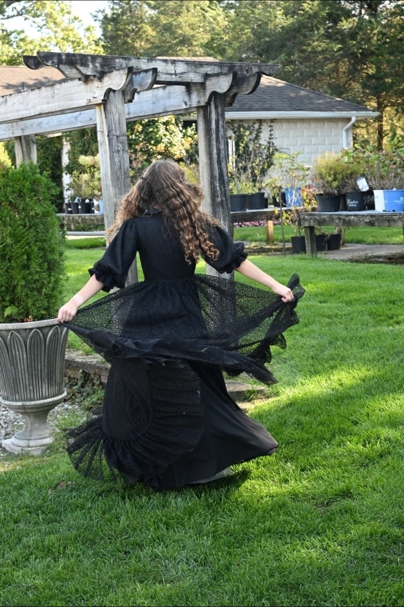 The Black Looplace Teen Dress is a striking design crafted from intricate circular black lace. Its gathered, flairy skirt is finished with a ruffled hem for added movement, while the fitted bodice is elevated by a sharp pointy collar adorned with colorful floral beads. Puffy sleeves with delicate ruffle edges complete the look, blending playful charm with elegant detail.
