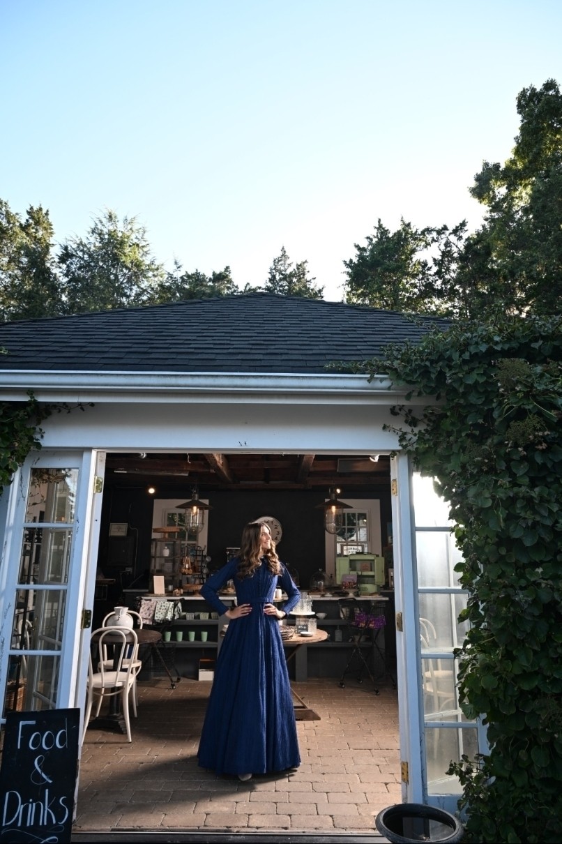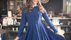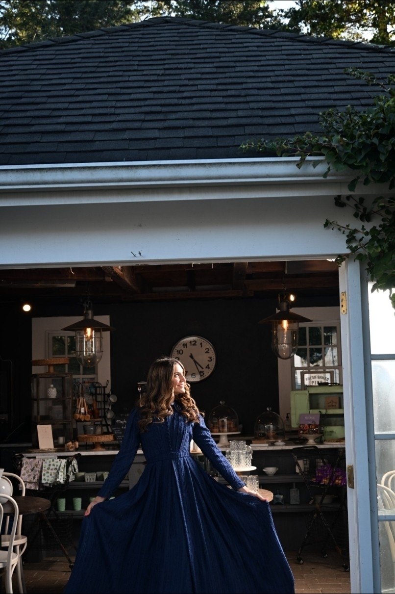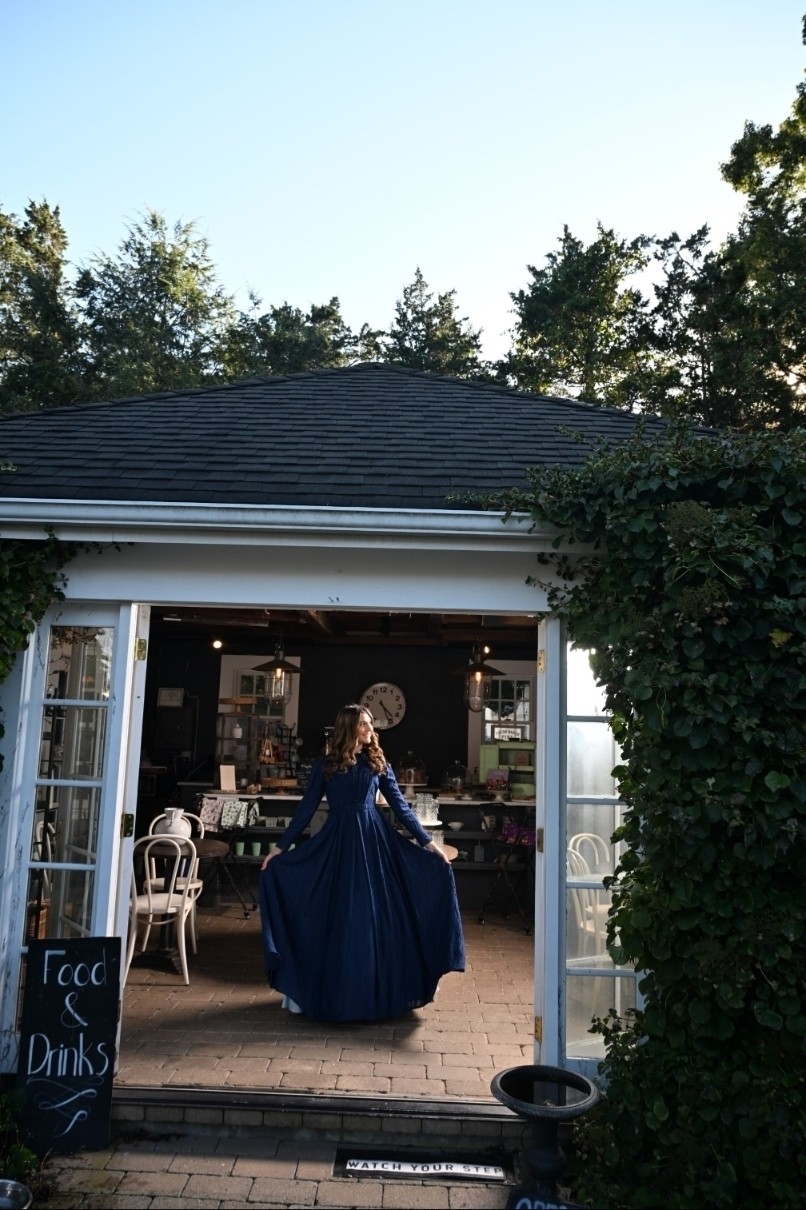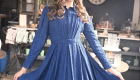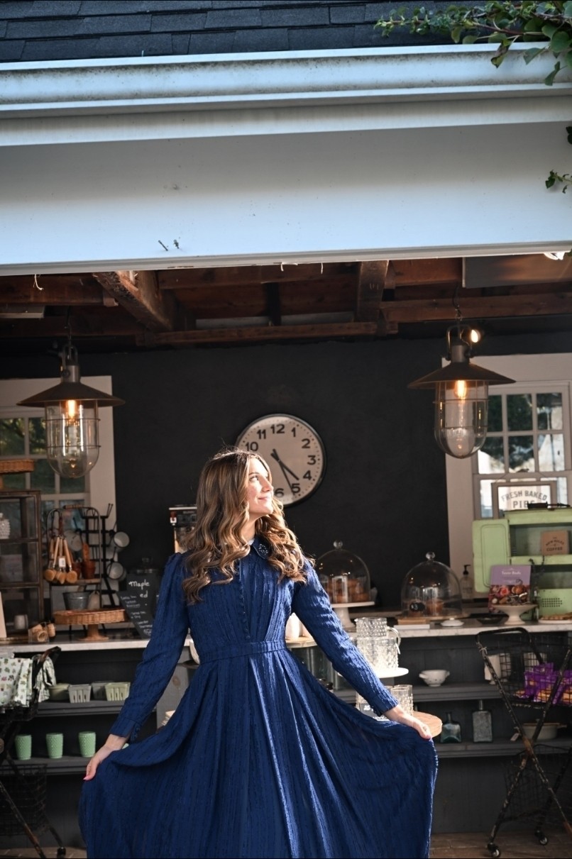 The Blue Chiffon Shirtwaist Dress blends crisp tailoring with airy charm, crafted from blue striped chiffon with box pleats that flow from a defined waistband. Its pleated bodice, fabric-covered buttons, pointy collar, and cuffed straight sleeves echo classic shirt details, reimagined in a soft, graceful silhouette.