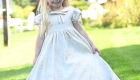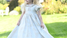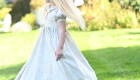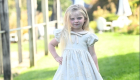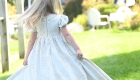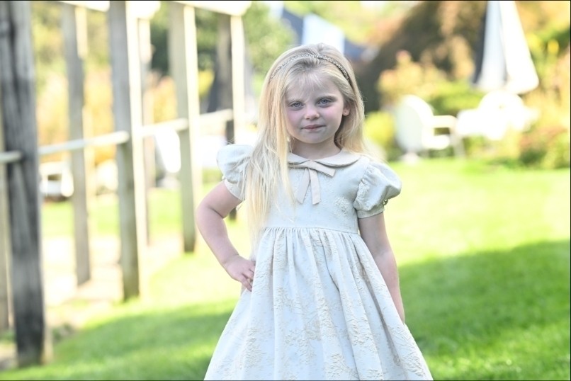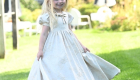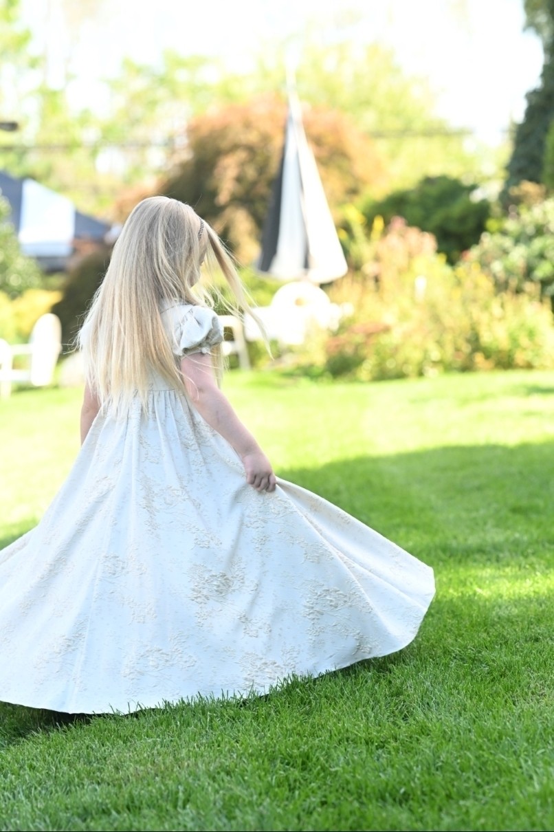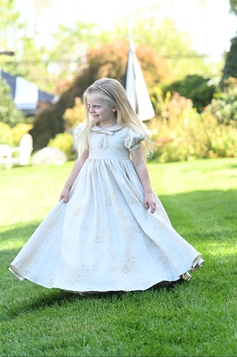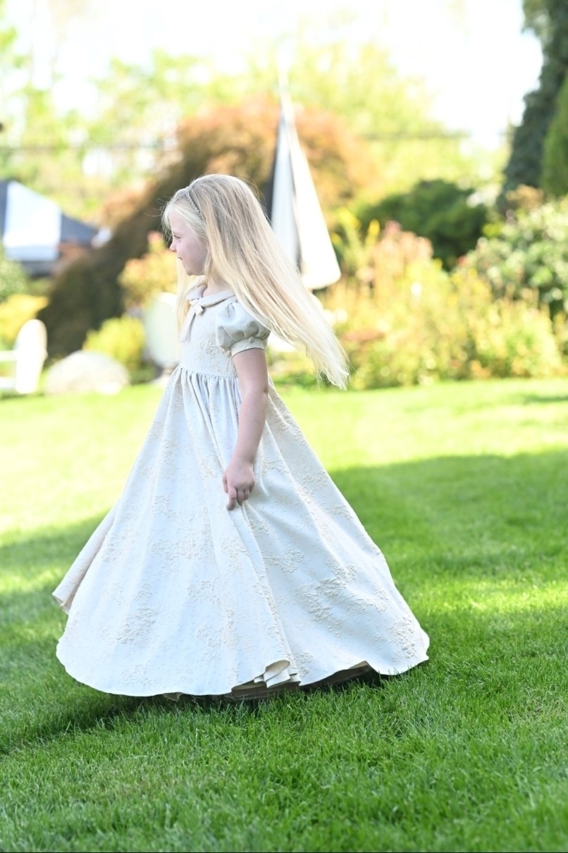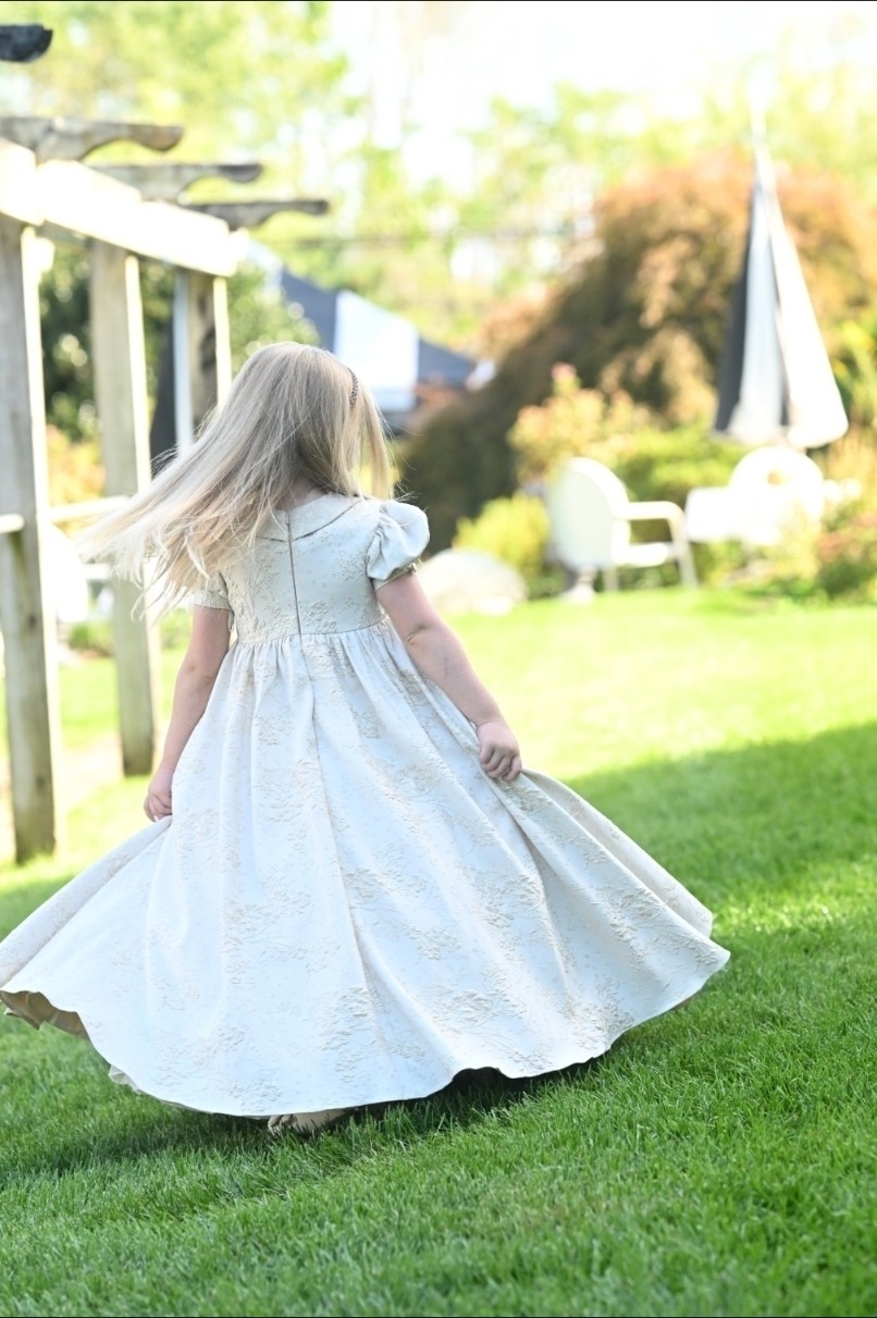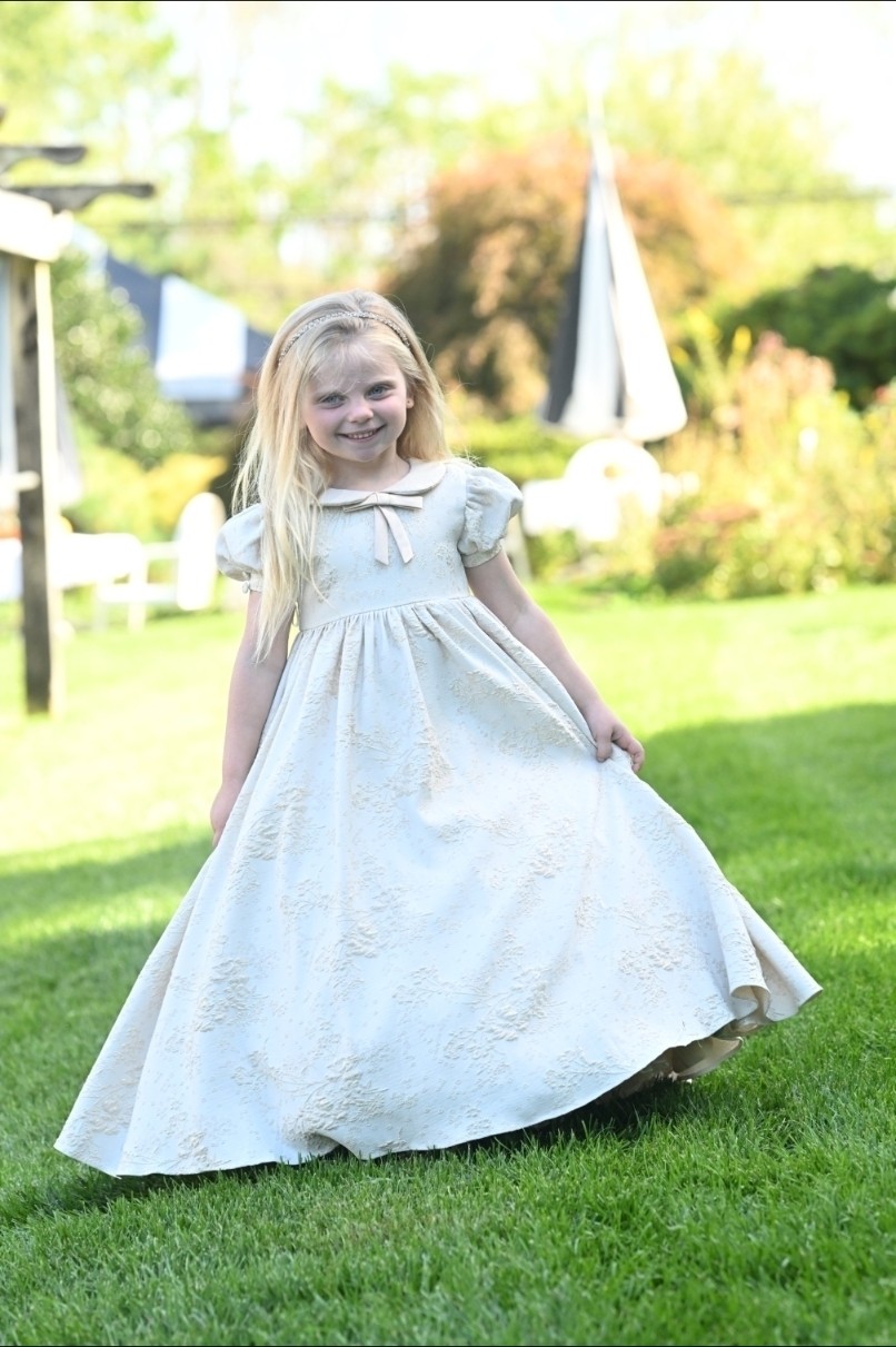 The Gilded Brocade Dress is crafted entirely from beige brocade woven with delicate gold detailing, giving it a luminous, regal finish. Its neckline features a small rounded collar in shimmering gold fabric, adding a refined touch. Just above the collar sits a flat bow in a deeper shade of gold, offering a subtle yet striking contrast that completes the dress’s elegant silhouette.