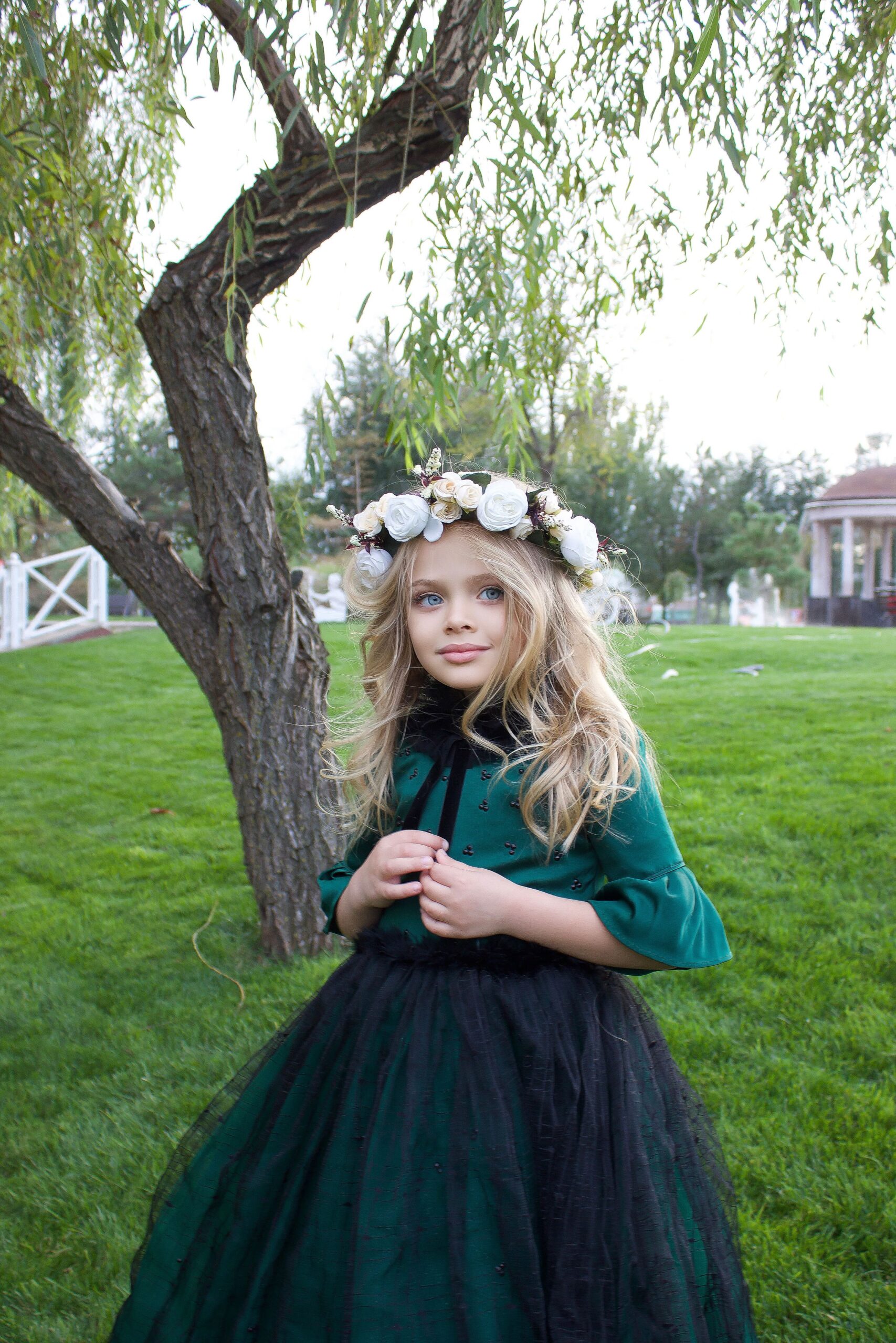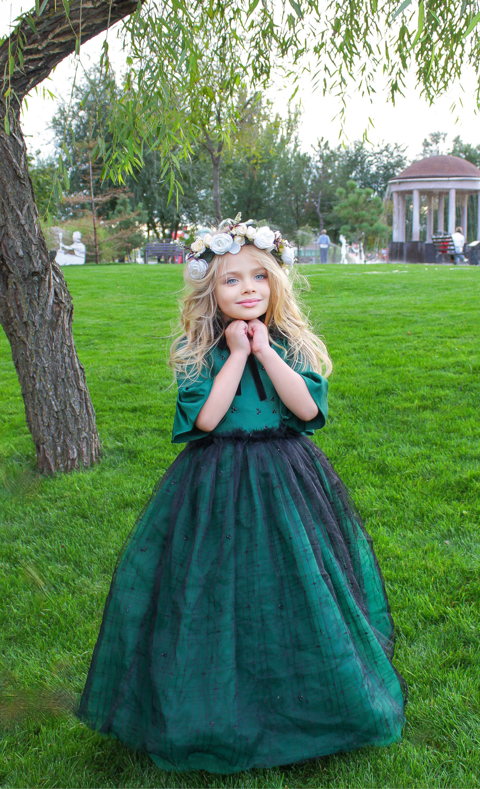 With its long, billowy maxi skirt and three-quarter length sleeves with ruffles, this Hunter Green gown is a testament to the elegant styles of years past. The rich green hue is darkened with an overlay of sheer lace on the skirt to give it extra texture.