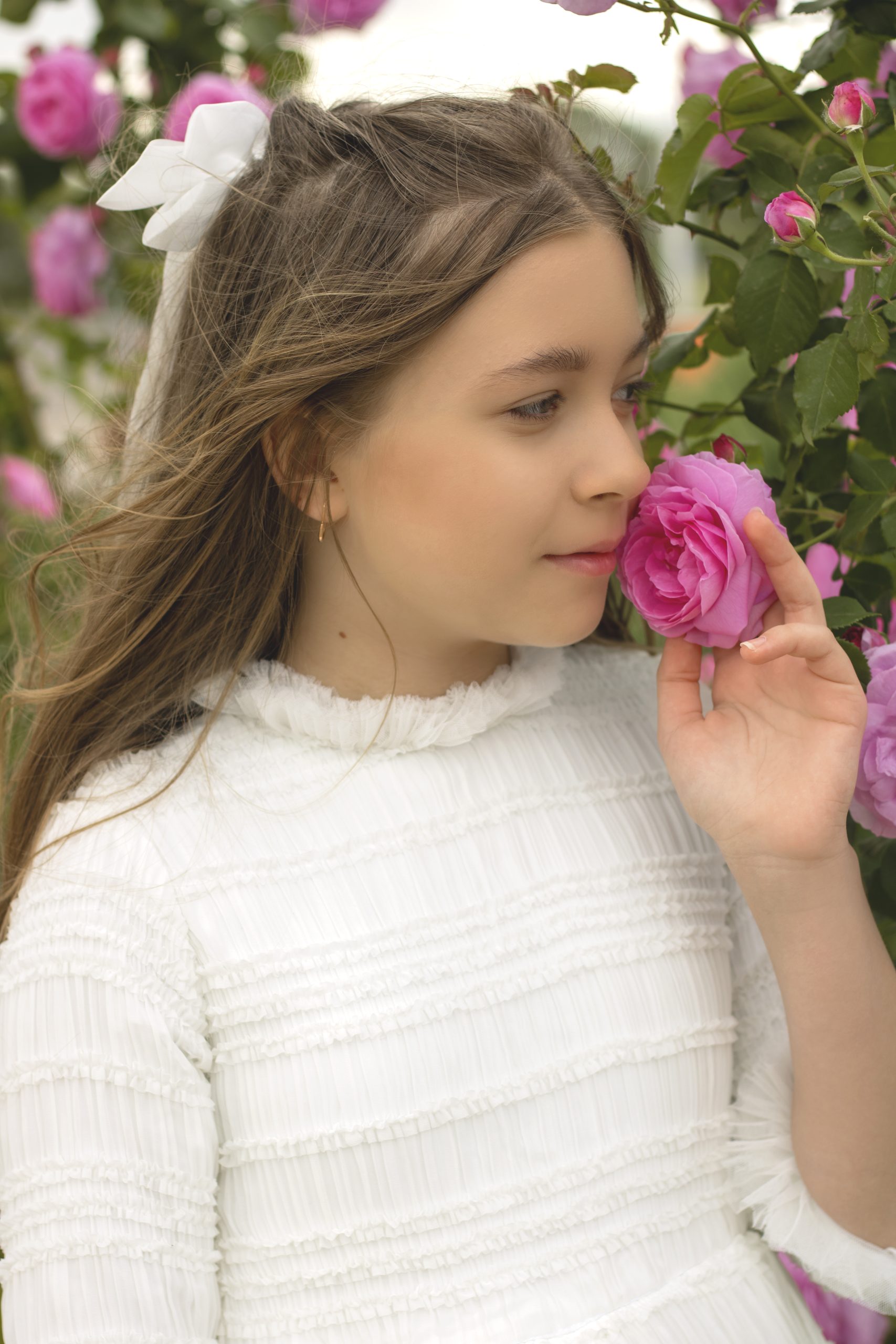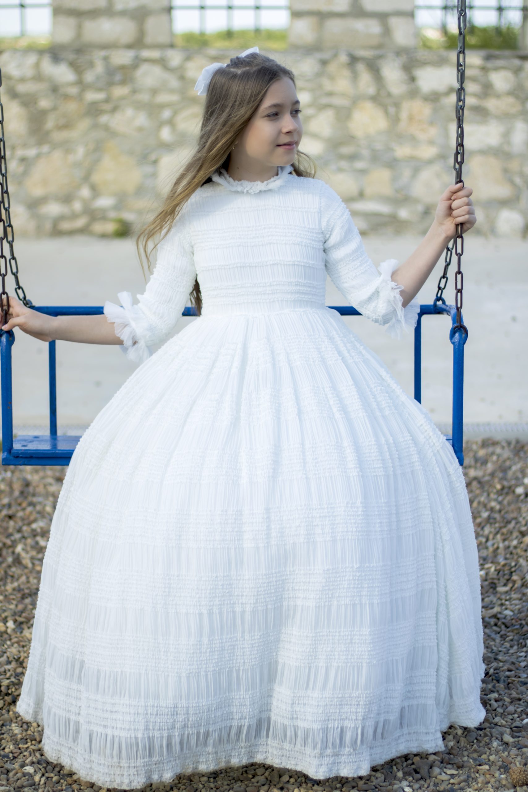 This dress features a beautiful blend of ruffles and pleats. The top of the dress showcases an eye-catching 3-and-1 ruffle pattern, spaced with pleats that create a delicate smocking effect. The lower part of the dress enhances this elegant look with groups of five ruffles, also spaced with pleats, adding texture and visual appeal. Perfect for special occasions, with its flowing fabric and intricate detailing!!