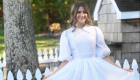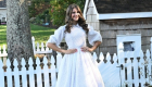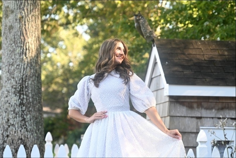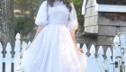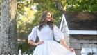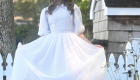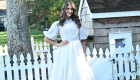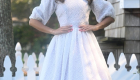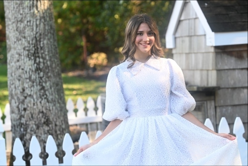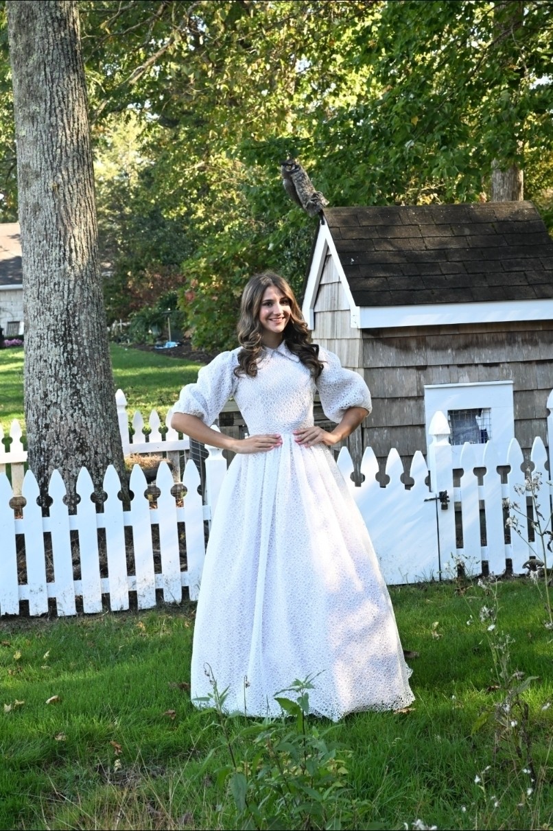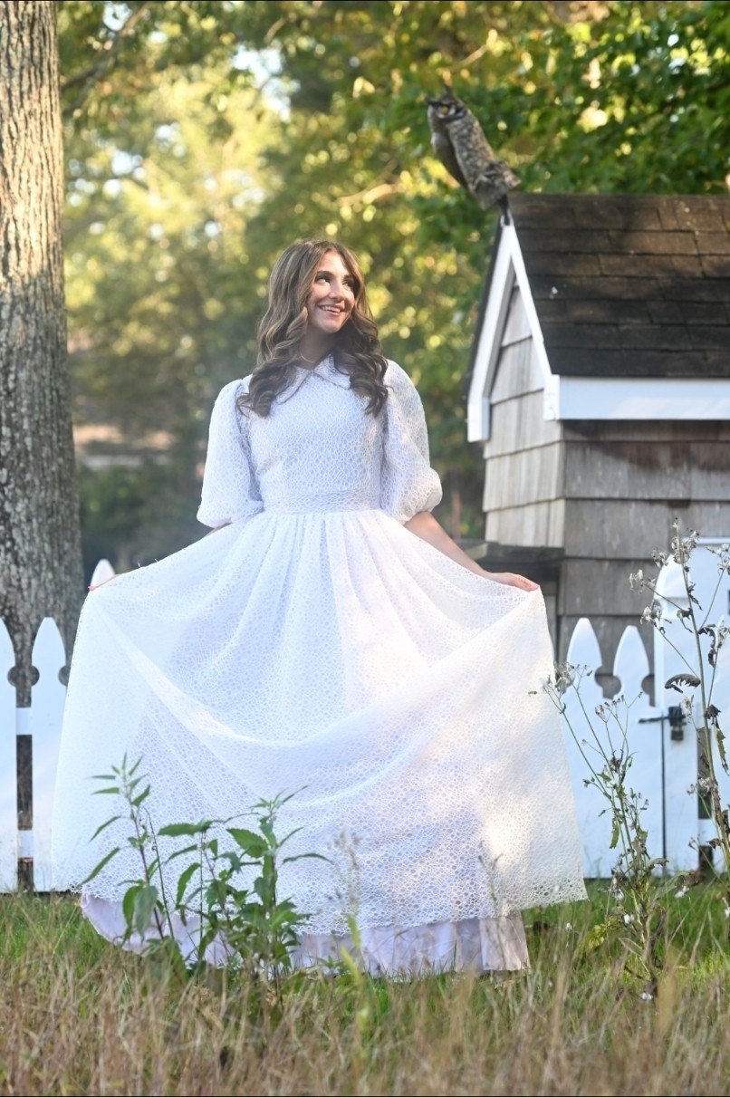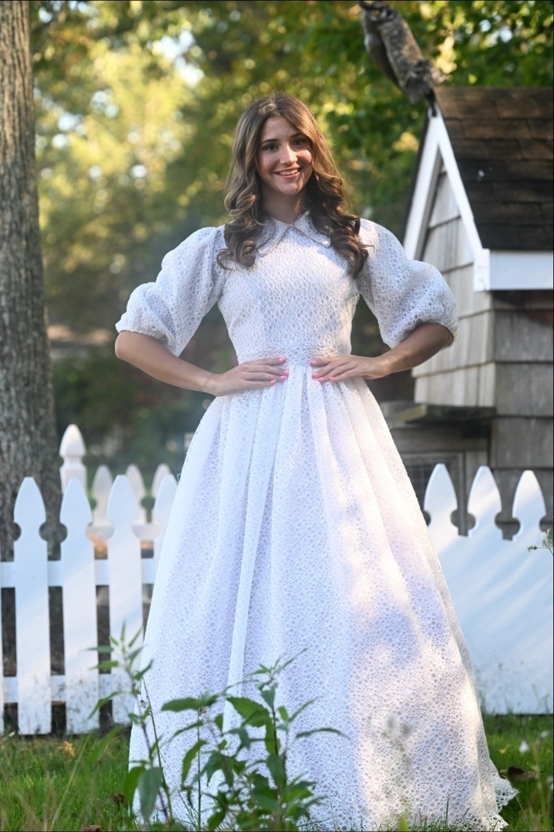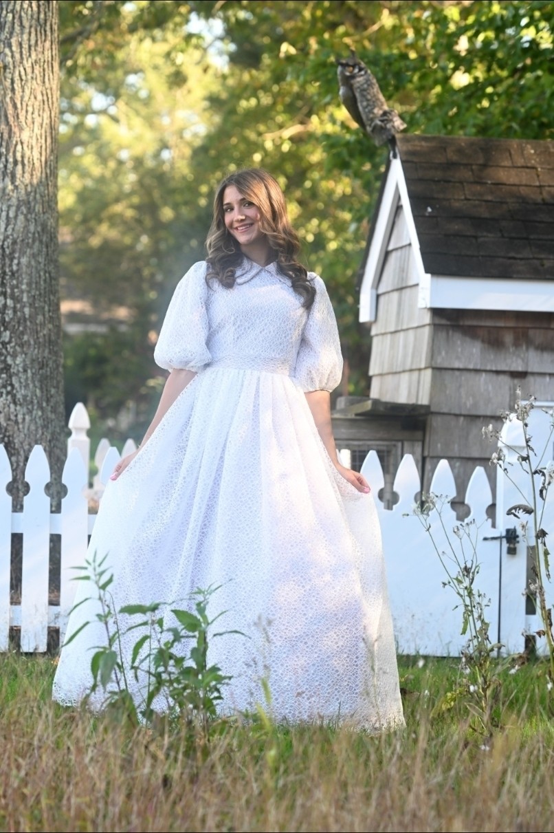 The Lavender Looplace Teen Dress is a striking design crafted from intricate ivory circular lace over lavender lining and tulle. Its gathered skirt gives it some flair, while the fitted bodice is elevated by a sharp pointy collar adorned with thin silver trimming around the rim. Puffy sleeves complete the look, blending playful charm with elegant detail.