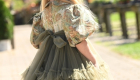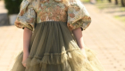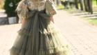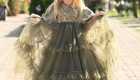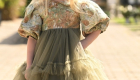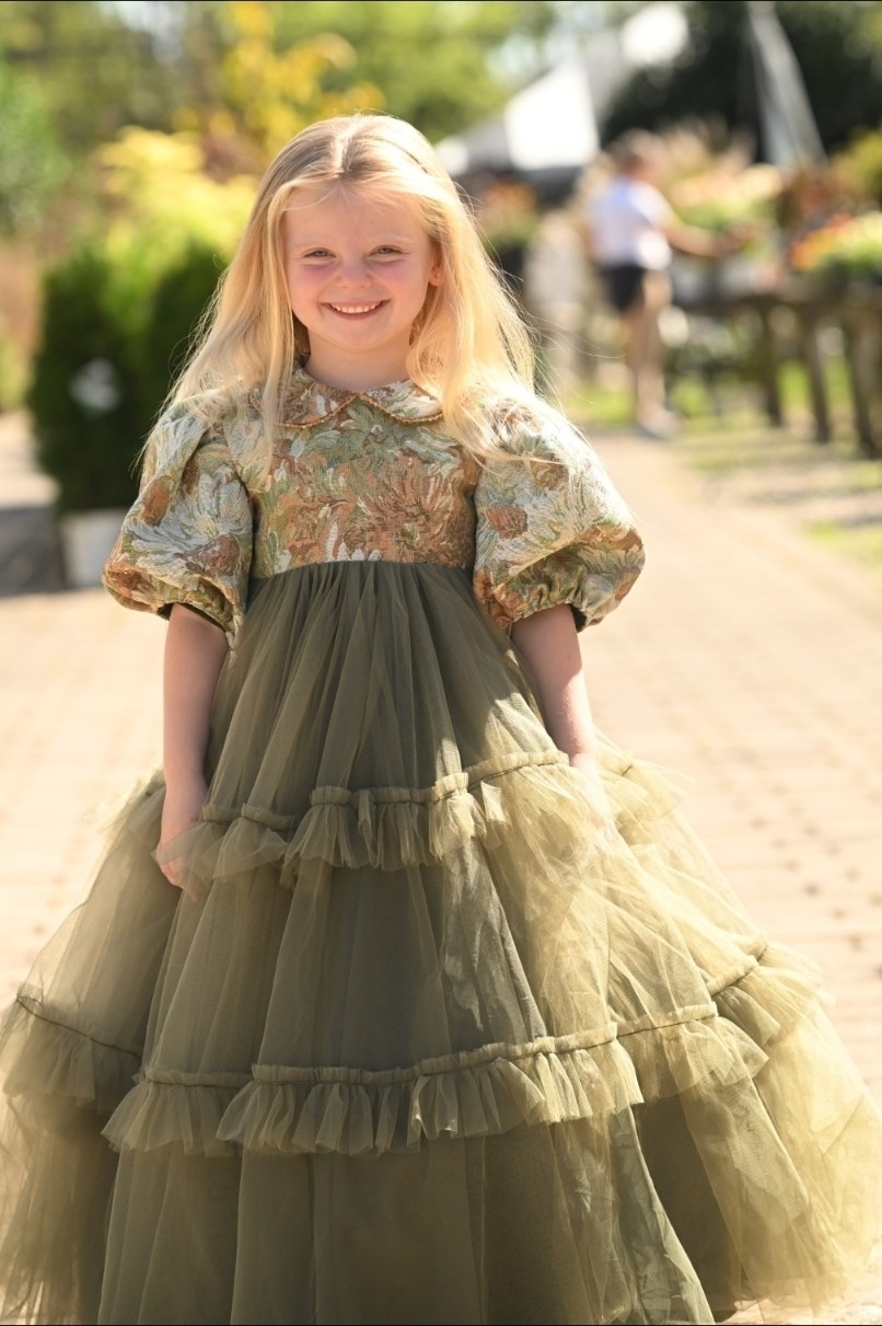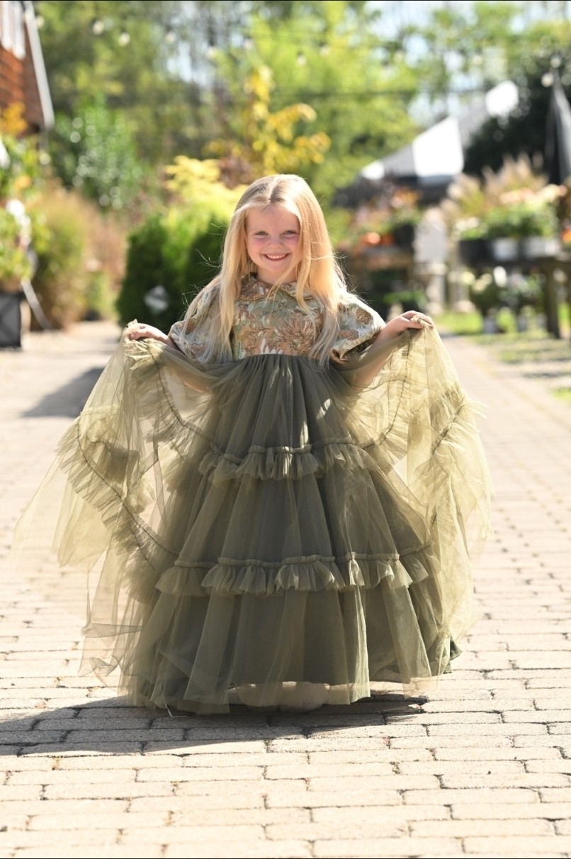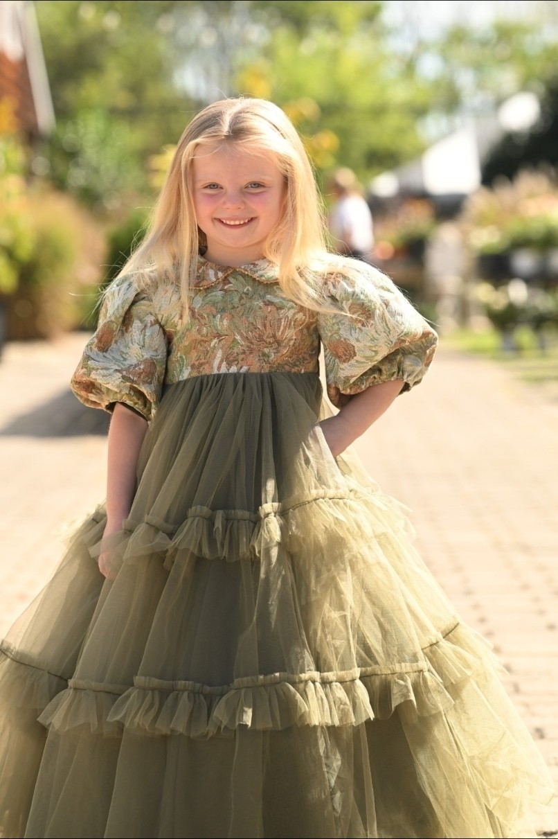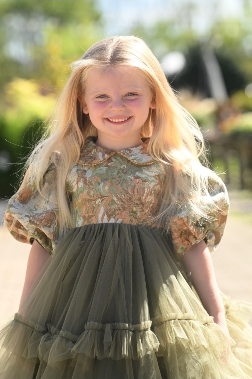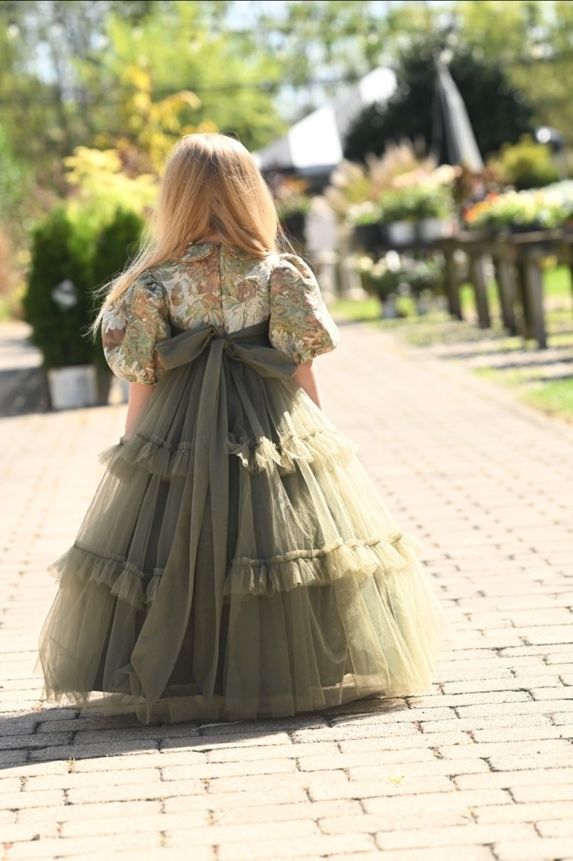Rooted in the forest, glowing in bronze. The Olive Hazelwood Dress blends earthy olive tulle with a bronze‑flecked floral brocade, finished with beaded collar and trailing ribbons. A woodland dream brought to life. 🌿✨
