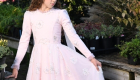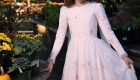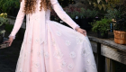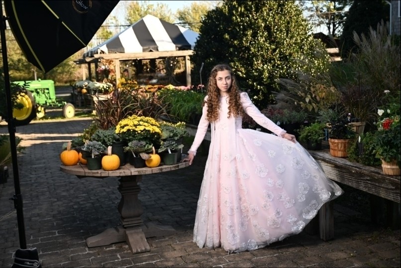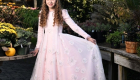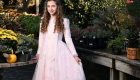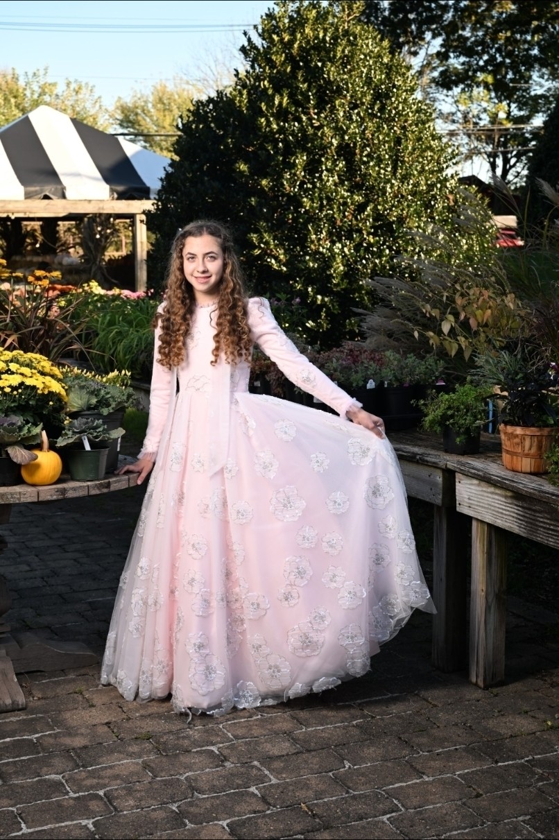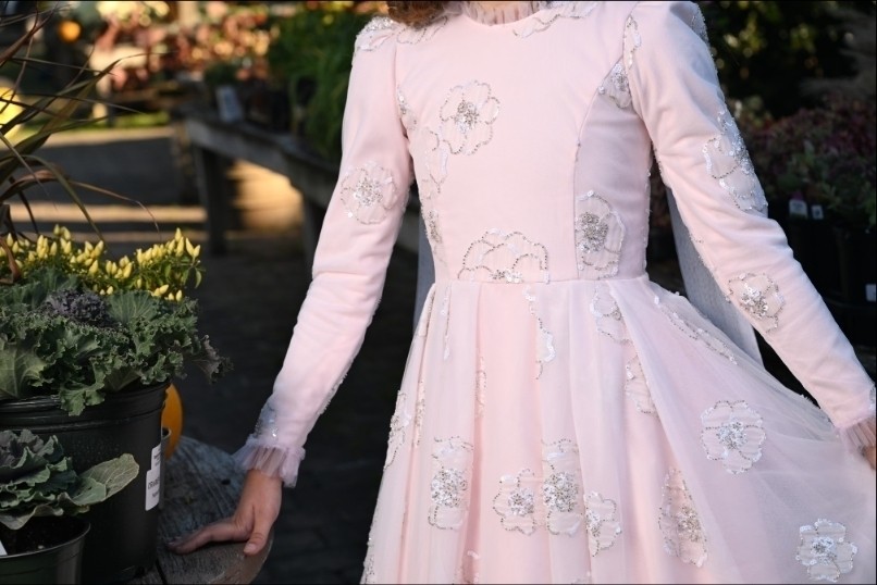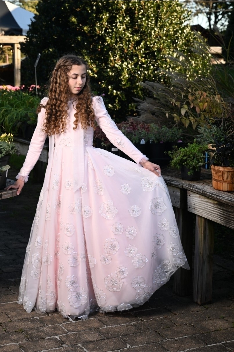 The Pink Blossombead Teen Dress glows with soft charm, its pink tulle base sprinkled with beaded flowers that bloom densely at the hem and scatter upward like rising petals. A pleated skirt, ruffled neckline, and straight sleeves complete the look with a sweet, graceful finish.