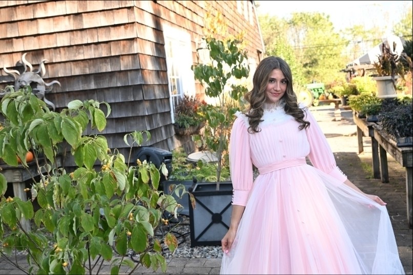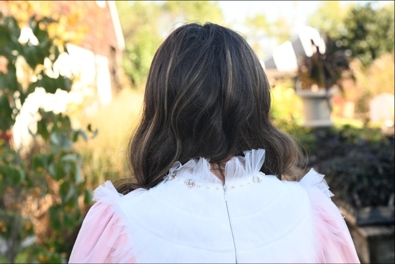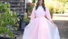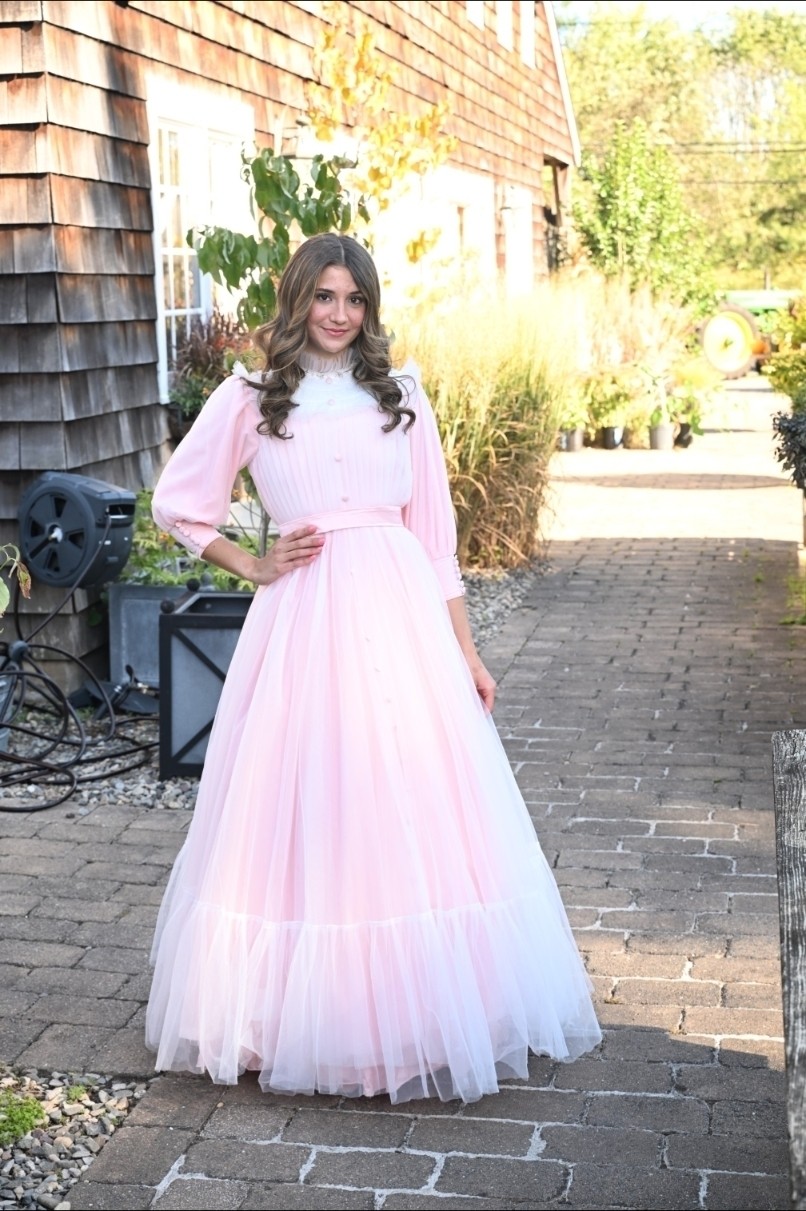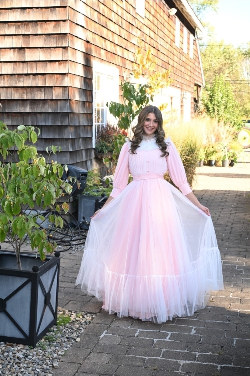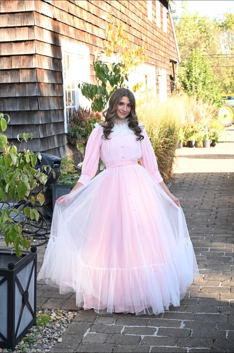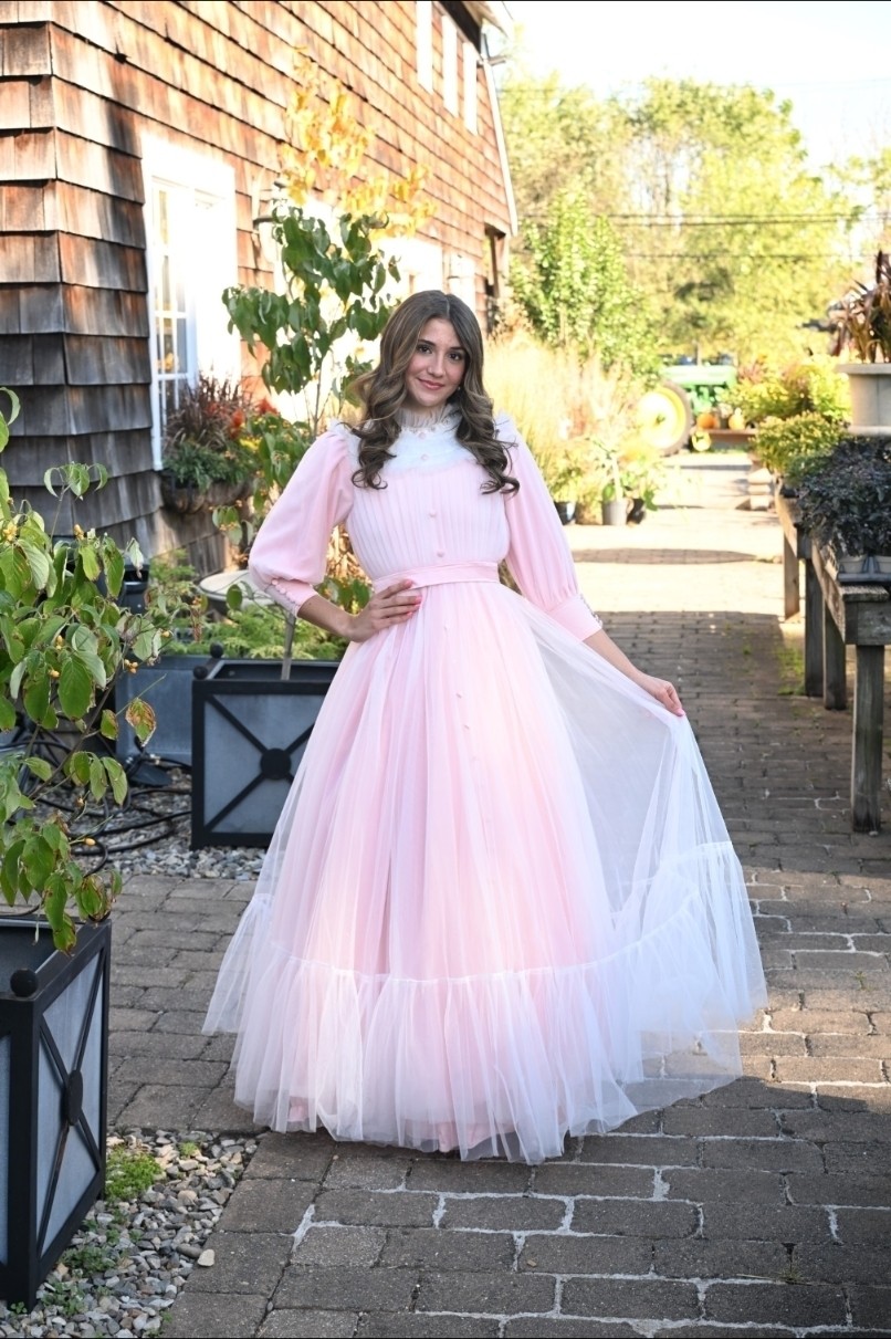 Soft and storybook-sweet, Pink Frillbourne teen dress blends vintage charm with delicate detail. The gathered skirt finishes in a playful ruffle, cinched at the waist with a matching belt. A pleated bodice features a white bib-like panel framed in ruffles and dainty beads, echoing the neckline’s soft flourish. Puffy sleeves end in buttoned cuffs, while a trail of fabric-covered buttons runs from collar to hem, adding a graceful, handcrafted touch.
