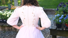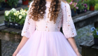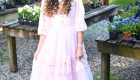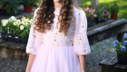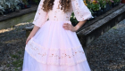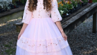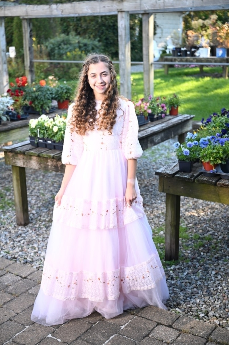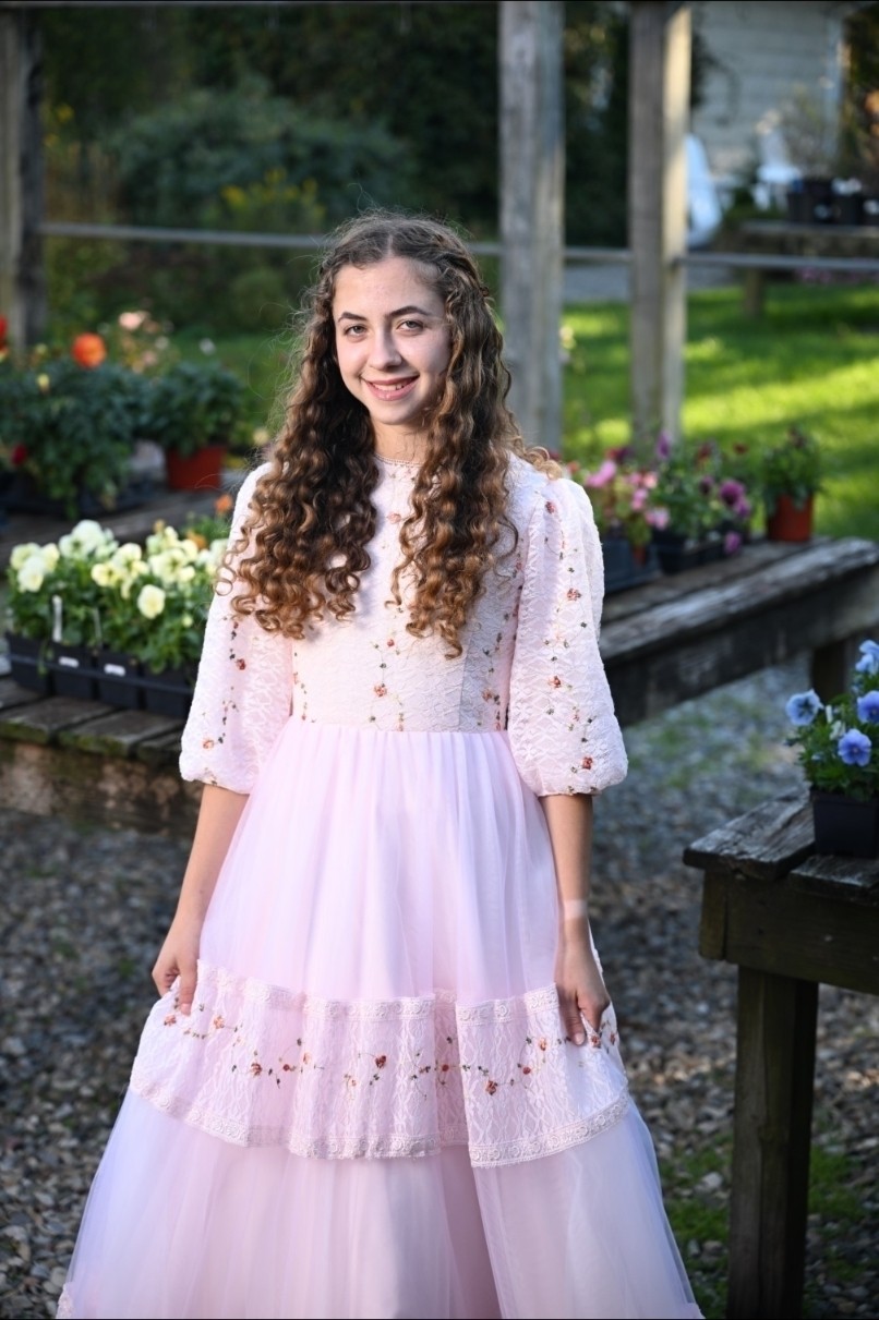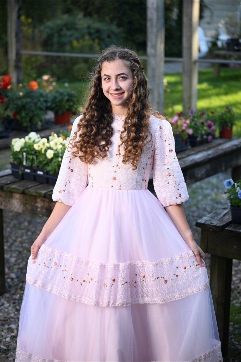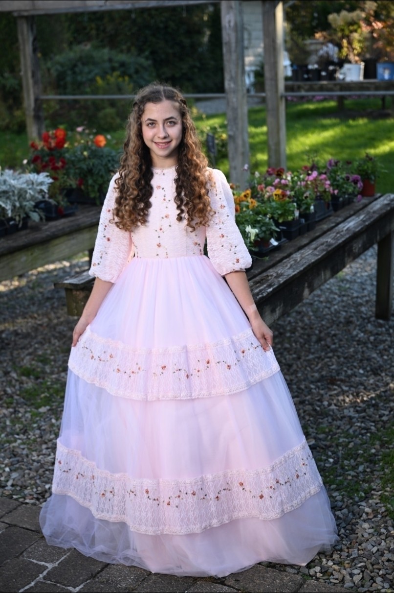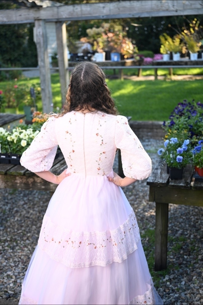 Graceful and full of charm, the Pink Garden Lace Teen Dress features a gathered ball gown skirt in soft pink tulle, accented by two central panels of blooming lace. The fitted bodice and puffy lace sleeves echo the floral motif, while a delicate trim frames the neckline for a graceful finish. A celebration of texture, bloom, and timeless elegance.