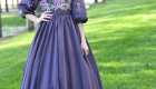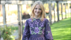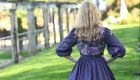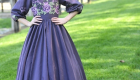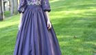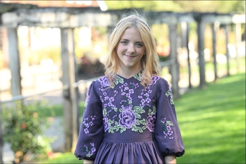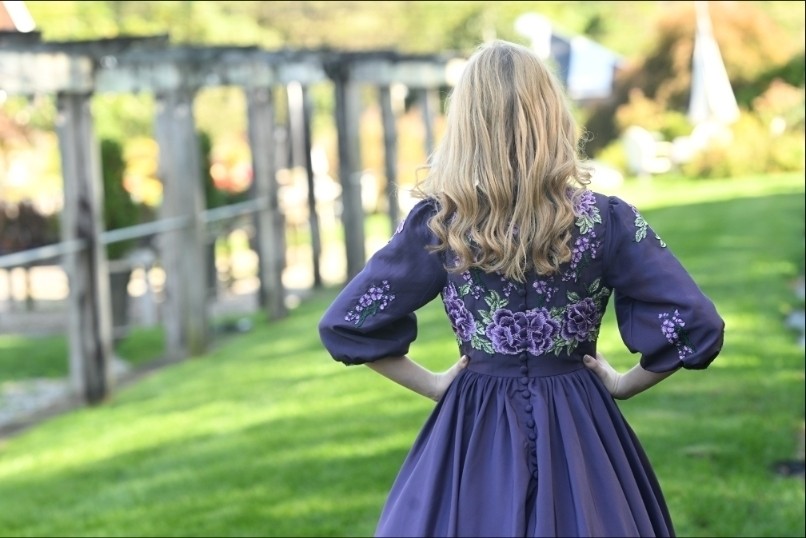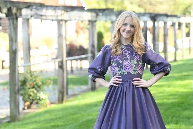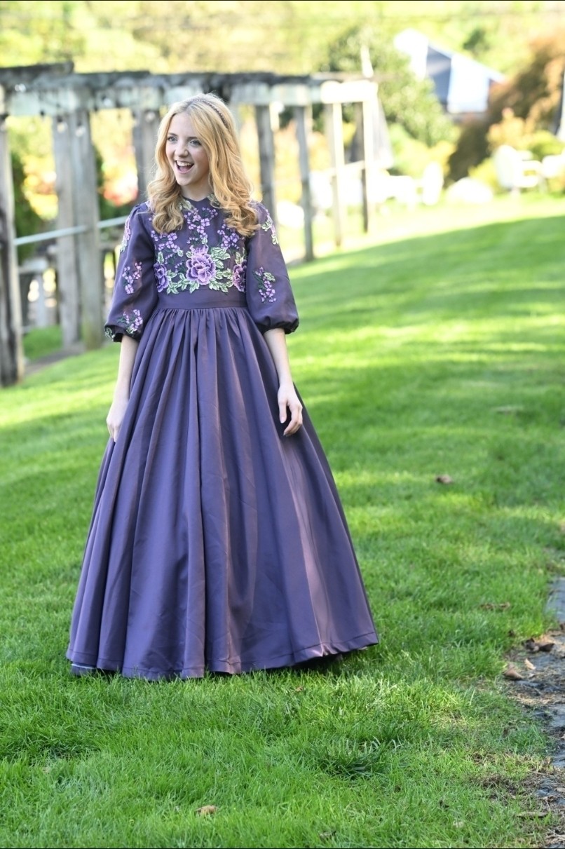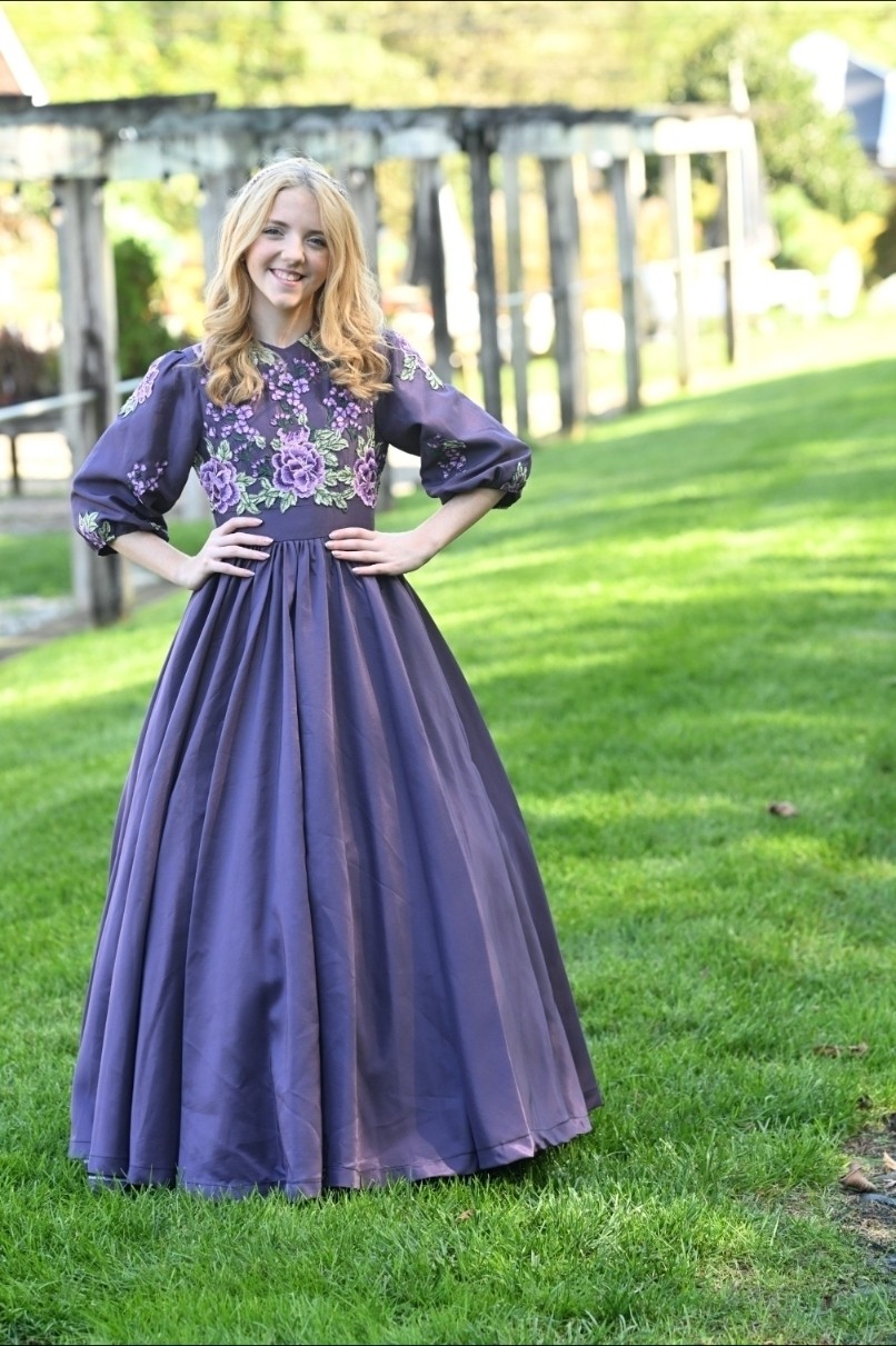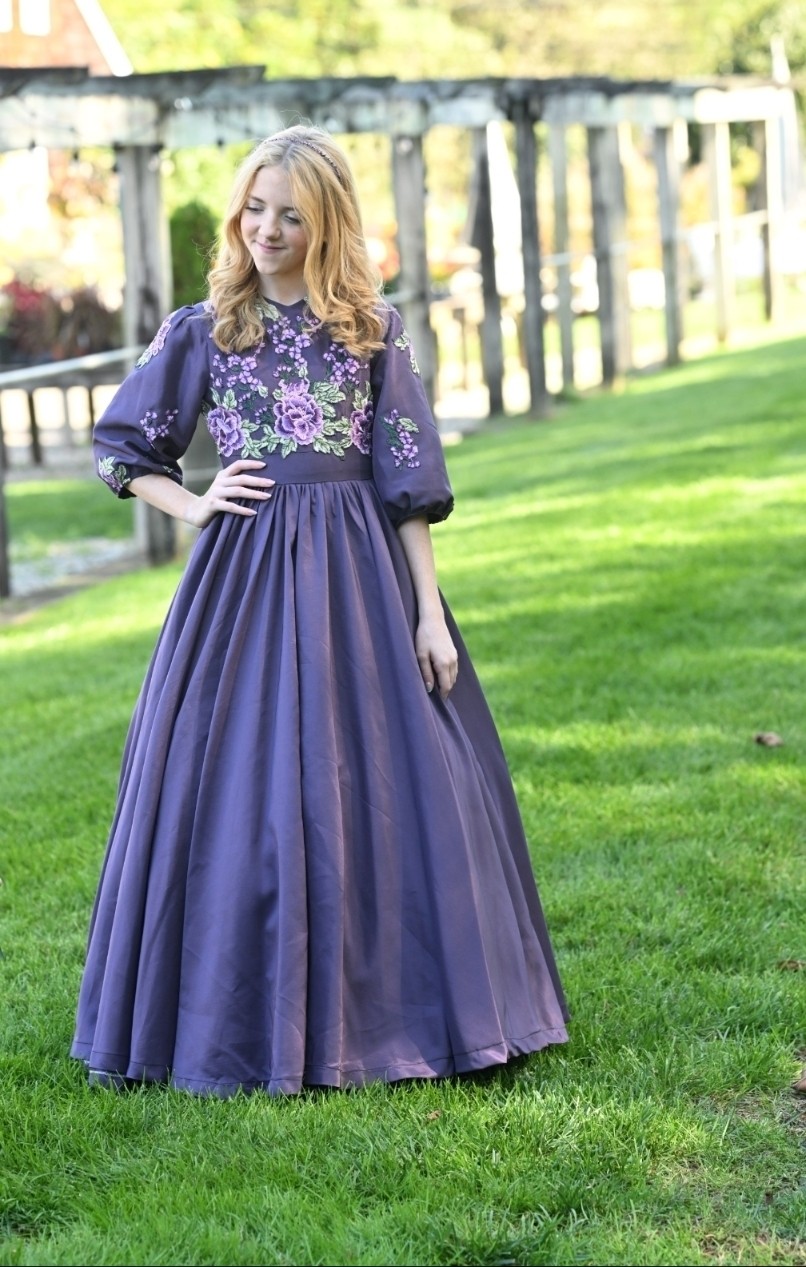 The Plum Satinbloom Teen Dress is a graceful blend of richness and charm, made from matte plum color satin with a gathered, flairy skirt that moves beautifully. A fitted bodice blooms with lavender and green floral appliques, framed by a soft V-neckline and puffy sleeves touched with scattered petals. A defined waistband adds structure, while buttons over the back zipper lend a classic finish.