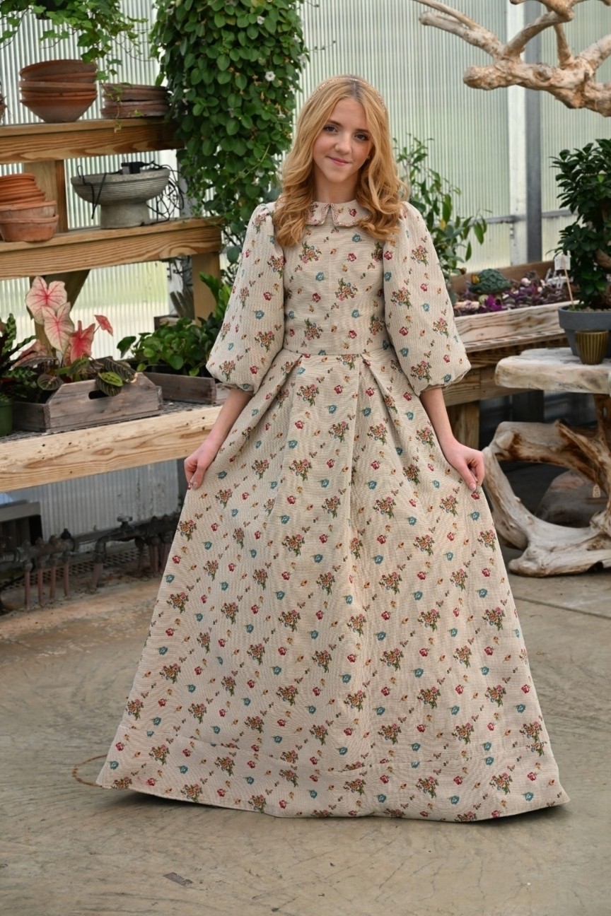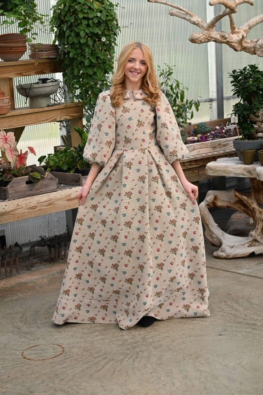 The Sandstone Garden Brocade Teen Dress 1.0 offers a sophisticated take on our signature floral brocade. Fully crafted in the rich Garden Brocade fabric, this design balances elegance with modern charm. The pointed collar and puffed sleeves lend a polished, tailored feel, while the pleated skirt adds graceful movement. A timeless silhouette made for teens ready for a more grown-up look — refined, confident, and effortlessly chic.