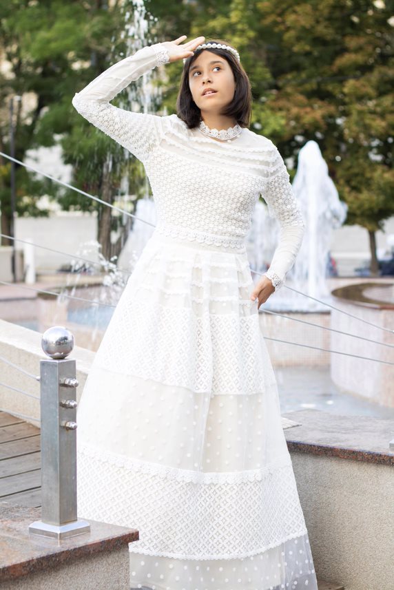 The Taupe Lace Striped is an antique style gown that brings the styles of yesteryear into the modern world. It is characterized primarily by its lacey texture, which features subtle polka dots in a matching hue. The taupe color makes it neutral enough to be accessorized with any kind of jewelry.